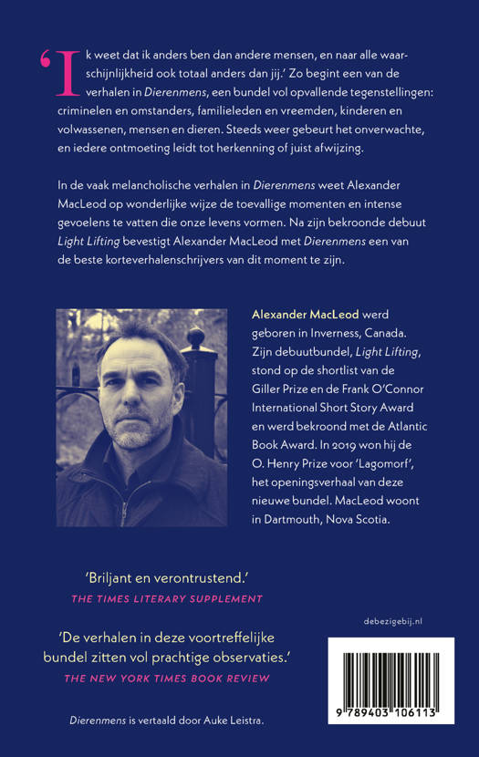 ‘Ik weet dat ik anders ben dan andere mensen, en naar alle waarschijnlijkheid ook totaal anders dan jij.’ Zo begint een van de verhalen in Dierenmens, een bundel vol opvallende tegenstellingen: criminelen en omstanders, familieleden en vreemden, kinderen en volwassenen, mensen en dieren. Steeds weer gebeurt het onverwachte, en iedere ontmoeting leidt tot herkenning of juist afwijzing. In de vaak melancholische verhalen in Dierenmens weet Alexander MacLeod op wonderlijke wijze de toevallige momenten en intense gevoelens te vatten die onze levens vormen. Na zijn bekroonde debuut Light Lifting bevestigt Alexander MacLeod met Dierenmens een van de beste korteverhalenschrijvers van dit moment te zijn.