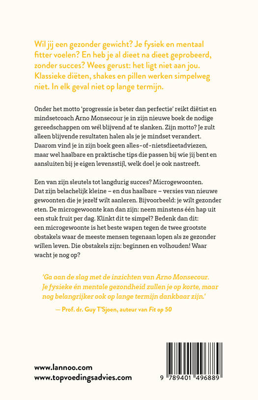 Onder het motto 'progressie is beter dan perfectie' reikt diëtist en mindsetcoach Arno Monsecour je in zijn nieuwe boek de nodige gereedschappen om wél blijvend af te slanken. Zijn motto? Je zult alleen blijvende resultaten halen als je je mindset verandert. Daarom vind je in zijn boek geen alles-of-nietsdieetadviezen, maar wel haalbare en praktische tips die passen bij wie jij bent en aansluiten bij je eigen levensstijl, welk doel je ook nastreeft.