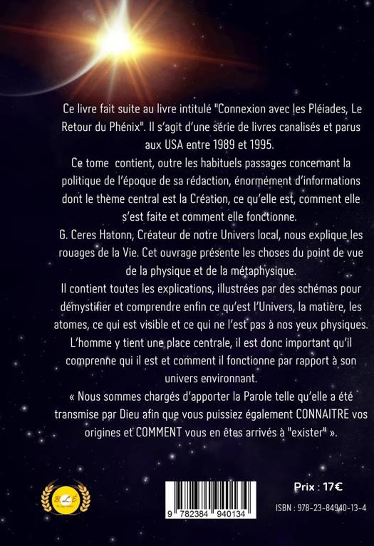 Ce tome contient, outre les habituels passages concernant la politique de l'époque de sa rédaction, énormément d'informations dont le thème central est la Création, ce qu'elle est, comment elle s'est faite et et comment elle fonctionne. G. Ceres Hatonn, Créateur de notre Univers local nous explique les rouages de la Vie. Cet ouvrage présente les du point de vue de la physique et de la métaphysique. Il contient toutes les explications, illustrées par des schémas pour démystifier et comprendre enfin ce qu'est l'Univers, la matière, les atomes, ce qui est visible et ce qui ne l'est pas à nos yeux physiques. L'homme y tient une place centrale, il est donc important qu'il comprenne qu'il est et comment il fonctionne par rapport à son univers environnant.