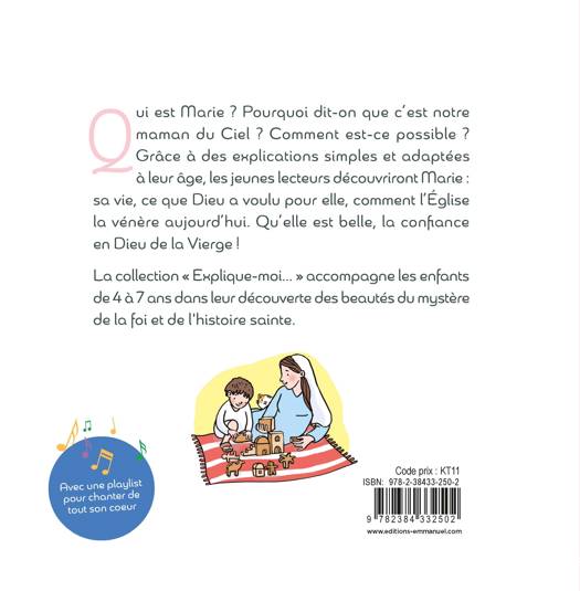 Qui est Marie ? Pourquoi dit-on que c’est notre maman du Ciel ? Comment est-ce possible ? Grâce à des explications simples et adaptées à leur âge, les jeunes lecteurs découvriront Marie : sa vie, ce que Dieu a voulu pour elle, comment l’Église la vénère aujourd’hui et ce qu’elle a à leur apprendre. Qu’elle est belle, la confiance en Dieu de la Vierge ! La collection « Explique-moi... » accompagne les enfants de 4 à 7 ans dans leur découverte des beautés du mystère de la foi et de l’histoire sainte.