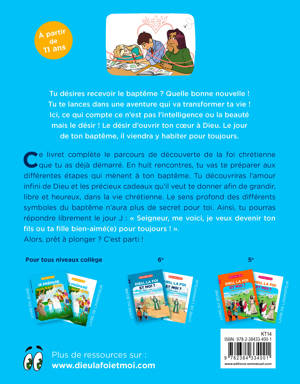 Un beau livret profond et dynamique pour les jeunes (à partir de 11 ans) qui se préparent au baptême. Ils vont découvrir l'amour de Dieu pour eux et la vie nouvelle que Dieu veut leur donner. En plusieurs étapes, ce parcours fait comprendre aux jeunes la signification du baptême et ses symboles et plus largement, de tous les sacrements. Les jeunes vont découvrir ce qu'est l'Église, la foi en Dieu, Père, Fils et Saint-Esprit. Chaque étape prévoit : - des extraits bibliques - Un petit enseignement interactif autour de la Bible, de grandes questions et d’activités pédagogiques et ludiques - Des repères historiques et culturels, mots-clés, œuvres d’art, quiz, défis, prières… - des vidéos à flasher (témoignages, chants…) ! - des défis à vivre pendant la semaine - des penses-bêtes pour les informations pratiques liées au baptême Un parcours complet, profond et joyeux, adapté aux collégiens d’aujourd’hui !