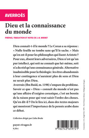 Qu'est-ce que Dieu connaît du monde ? Le Coran a sa réponse : « nulle feuille ne tombe sans qu'Il le sache ». Mais qu'en est-il pour les philosophes qui lisent Aristote ? Pour eux, disent leurs adversaires, Dieu n'est qu'un pur intellect, qui soit ne connaît que lui-même, soit n'a du réel qu'une connaissance générale. Alternative inadmissible pour la théologie : les êtres abandonnés à leur contingence n'auraient plus de sens et Dieu ne serait plus Dieu. Averroès (Ibn Rushd, m. 1198) s'empare du problème. Savoir ce que « Dieu » connaît du monde n'est pas qu'une affaire d'exégèse coranique, c'est un besoin de la raison pour qui veut saisir l'ordre des choses. Qu'en dit-il ? On le lira ici, dans des textes majeurs qui montrent l'importance de la pensée arabe dans ce débat.