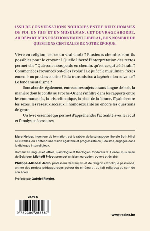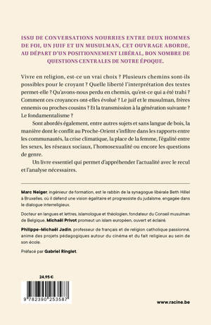 Issu de conversations nourries entre deux hommes de foi, un juif et un musulman, cet ouvrage aborde, au départ d'un positionnement libéral, bon nombre de questions centrales de notre époque.