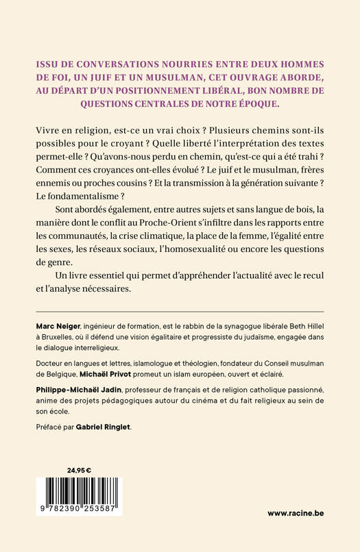 Issu de conversations nourries entre deux hommes de foi, un juif et un musulman, cet ouvrage aborde, au départ d'un positionnement libéral, bon nombre de questions centrales de notre époque. Vivre en religion, est-ce un vrai choix ? Plusieurs chemins sont-ils possibles pour le croyant ? Quelle liberté l'interprétation des textes permet-elle ? Qu'avons-nous perdu en chemin, qu'est-ce qui a été trahi ? Comment ces croyances ont-elles évolué ? Le juif et le musulman, frères ennemis ou proches cousins ? Et la transmission à la génération suivante ? Le fondamentalisme ? Sont abordés également, sans langue de bois, la manière dont le conflit au Proche-Orient s'infiltre dans les rapports entre les communautés, la crise climatique, la place de la femme, l'égalité entre les sexes, les réseaux sociaux, l'homosexualité et les questions de genre, parmi d'autres sujets qui intéresseront tous ceux qui se posent des questions sur la place de la religion dans le monde.