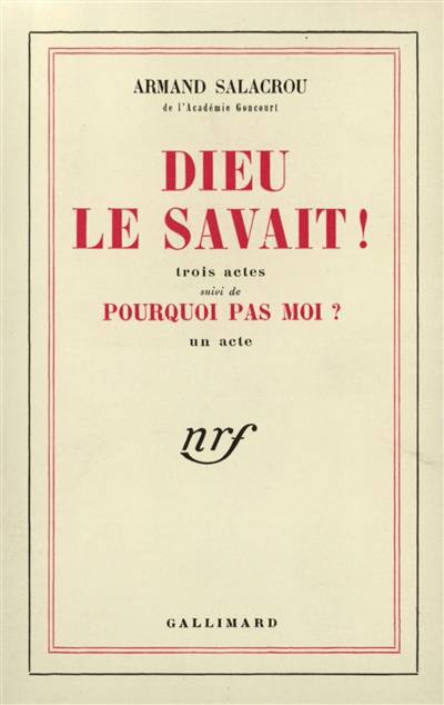Dans Dieu le savait, Armand Salacrou aborde ce vieux et insoluble problème de théologie ; Dieu sait tout : il sait donc si je serai sauvé ou damné : mes oeuvres, quelles qu'elles soient, ne peuvent rien changer à une fin qui est, de toute éternité, connue de Dieu. C'est l'un des problèmes que nous avons tous été amenés à nous poser dans le secret de nos coeurs - et qu'Armand Salacrou a traité en grand dramaturge. Dans une maison en ruine du Havre de 1944, une femme jeune encore, et belle, pleure la mort de son mari, déporté et fusillé. En même temps, elle lui en veut d'une conduite héroïque, certes, mais qui a amené d'irréparables catastrophes. Elle rend responsables de ces catastrophes les amis du mari mort, ceux qui l'ont entraîné, puis abandonné, et, peut-être, trahi. Le vrai responsable de la mort de son mari - on le découvre enfin, c'est elle-même qui, sans s'en douter, presque innocemment, a enlevé le goût de vivre à celui qu'elle aime et qu'elle pleure. Pourquoi pas moi ? pièce en un acte qui complétait le spectacle où fut donné Poof, peut être pris comme une sorte de "proverbe", mais un proverbe sans douceur ni aménité. On y voit une jeune bonne venue de l'Assistance publique, et qui se venge d'un destin malheureux en en forgeant un qui lui convient mieux. L'intelligence et la malhonnêteté, l'honneur et l'amertume se fondent en un dialogue varié et souple.