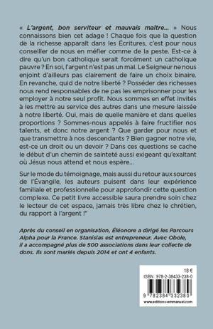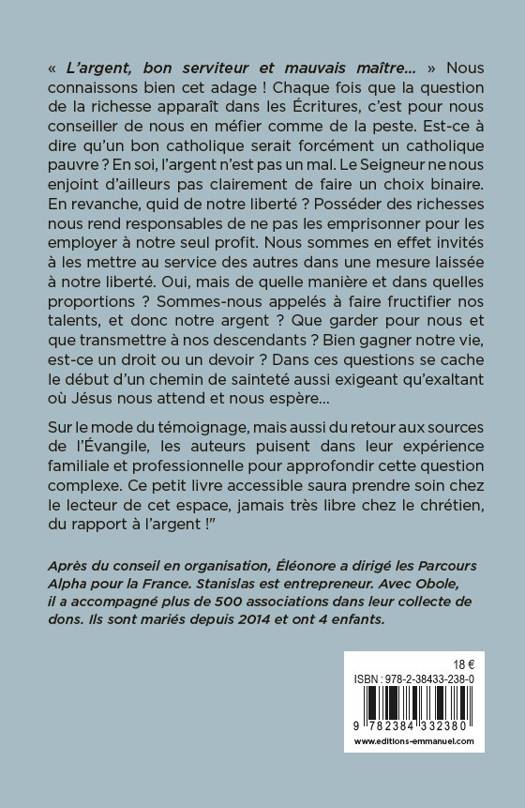 L’argent, bon serviteur et mauvais maître… A chaque fois que la question de la richesse et de l’argent apparaît dans les Ecritures, c’est pour s’en méfier comme de la peste. Est-ce à dire qu’un bon catholique est nécessairement un catholique pauvre ? Sur le mode du témoignage, mais aussi du retour aux sources de l’Evangile, Stanislas et Eléonore puisent dans leur expérience pour nous livrer ce passionnant essai. Non, l'argent n'est pas un mal en soi. En avoir nous rend responsables de ne pas l’emprisonner à notre seul profit, mais de le mettre au service des autres dans une mesure qui est laissée à notre liberté. Un petit livre accessible et capable de prendre soin chez le lecteur de cet espace, jamais très libre chez le chrétien, du rapport à l’argent !
