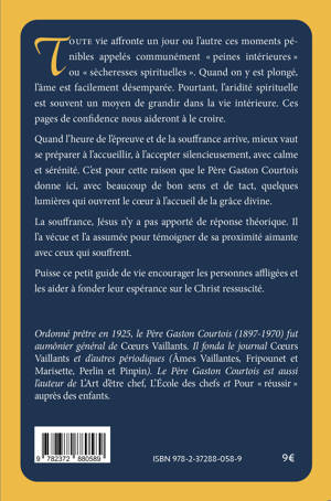 Toute vie affronte un jour ou l’autre ces moments pénibles appelés communément « peines intérieures » ou « sècheresses spirituelles ». Quand on y est plongé, l’âme est facilement désemparée. Pourtant, l’aridité spirituelle est souvent un moyen de grandir dans la vie intérieure. Ces pages de confidence nous aideront à le croire. Quand l’heure de l’épreuve et de la souffrance arrive, mieux vaut se préparer à l’accueillir, à l’accepter silencieusement, avec calme et sérénité. C’est pour cette raison que le Père Gaston Courtois donne ici, avec beaucoup de bon sens et de tact, quelques lumières qui ouvrent le cœur à l’accueil de la grâce divine. La souffrance, Jésus n’y a pas apporté de réponse théorique. Il l’a vécue et l’a assumée pour témoigner de sa proximité aimante avec ceux qui souffrent. Puisse ce petit guide de vie encourager les personnes affligées et les aider à fonder leur espérance sur le Christ ressuscité.