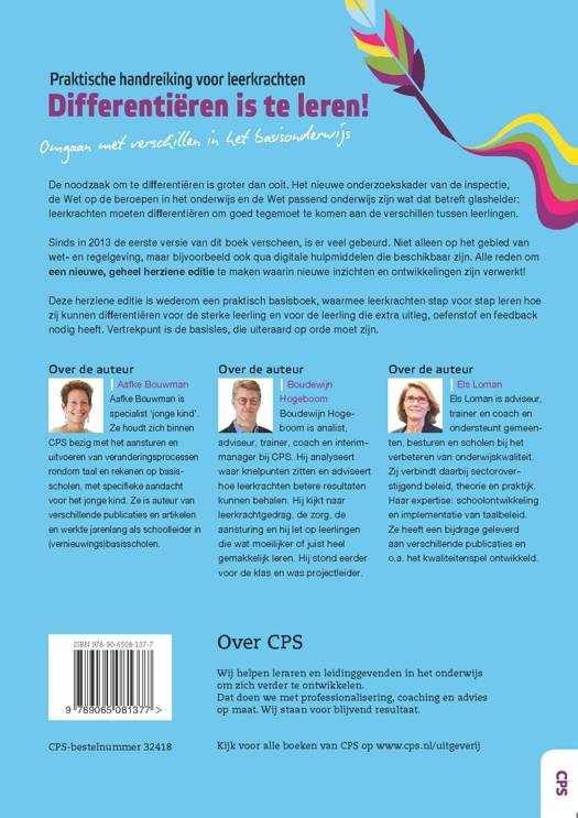 De noodzaak om te differentiëren is groter dan ooit. Het nieuwe onderzoekskader van de inspectie, de Wet op de beroepen in het onderwijs en de Wet passend onderwijs zijn wat dat betreft glashelder: leerkrachten moeten differentiëren om goed tegemoet te komen aan de verschillen tussen leerlingen. Sinds in 2013 de eerste versie van dit boek verscheen, is er veel gebeurd. Niet alleen op het gebied van wet- en regelgeving, maar bijvoorbeeld qua digitale hulpmiddelen die beschikbaar zijn. Alle reden om een nieuwe, geheel herziene editie te maken waarin nieuwe inzichten en ontwikkelingen zijn verwerkt! Deze herziene editie is wederom een praktisch basisboek, waarmee leerkrachten stap voor stap leren hoe zij kunnen differentiëren voor de slimme leerling en voor de leerling die extra uitleg, oefenstof en feedback nodig heeft. Vertrekpunt is de basisles, die uiteraard op orde moet zijn.