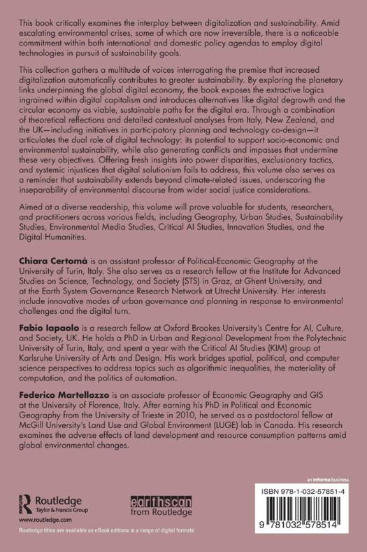 This book critically examines the interplay between digitalization and sustainability. It will prove valuable for students, researchers, and practitioners across various fields, including Geography, Urban Studies, Sustainability Studies, Environmental Media Studies, Critical AI Studies, Innovation Studies, and the Digital Humanities.