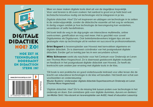 'Dit boek is een praktische en goed onderbouwde leidraad voor elke leraar die de kracht van educatieve technologie in de klas wil benutten. Het biedt een schat aan voorbeelden en ondersteuning.' - Wouter Buelens | onderzoeker digitale didactiek Expertisecentrum Onderwijs en Leren (Thomas More Hogeschool) 'Digitale didactiek. Hoe? Zo! is de missing link tussen praten over technologie in het onderwijs en doen. Een onmisbare gids voor digitale dummies, durvers en denkers.' Jan-Wolter Smit | hbo-docent en lerarenopleider aan ArtEZ, Head of education LessonUp