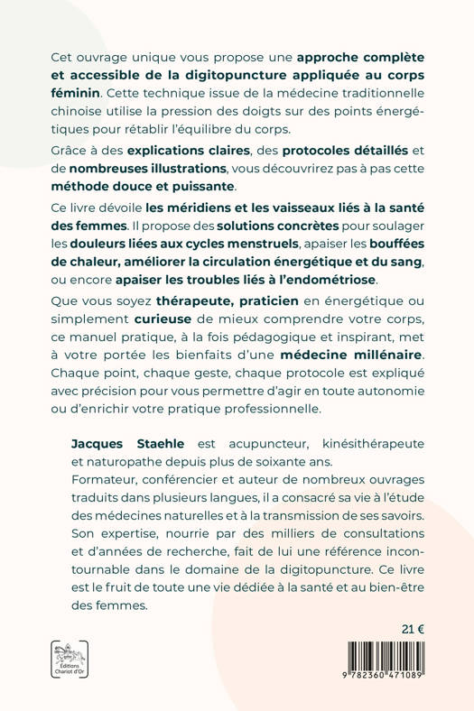 Et si vos mains pouvaient apaiser les déséquilibres de votre corps ? Règles douloureuses, endométriose, syndrome prémenstruel, bouffées de chaleur, troubles hormonaux ou fatigue chronique : ce guide pratique propose des protocoles simples et illustrés pour rétablir l’harmonie énergétique du corps, apaiser vos symptômes et retrouver équilibre et bien-être au naturel. Grâce à des explications limpides, des schémas précis et des conseils d’application pas à pas, ce livre vous permet d’agir en toute autonomie ou d’enrichir votre pratique thérapeutique. Sous la guidance de Jacques Staehle, pionnier des médecines naturelles depuis plus de 60 ans, découvrez comment la digitopuncture, issue de la tradition chinoise, peut soutenir votre santé féminine à chaque étape de la vie.