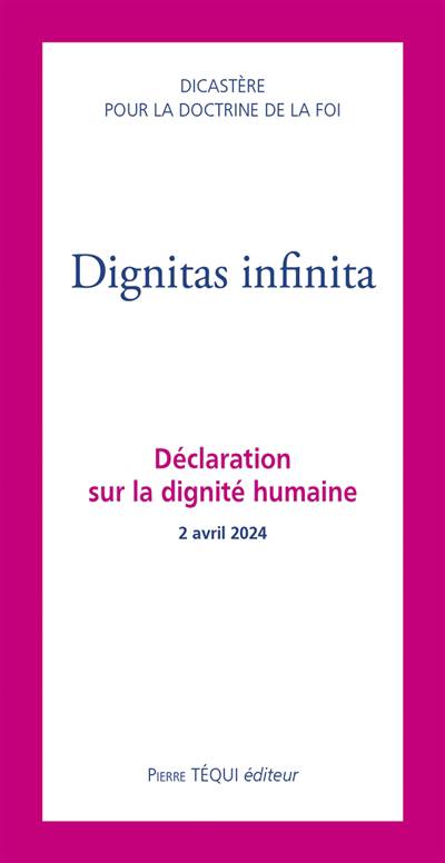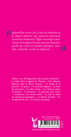 Une nouvelle déclaration sur la dignité humaine, très importante, qui abordera des questions sociales mais aussi des questions morales telles que le changement de sexe, la gestation pour autrui et les idéologies du genre. « Aujourd'hui encore, face à tant de violations de la dignité humaine qui menacent gravement l'avenir de l'humanité, l'Église encourage la promotion de la dignité de toute personne humaine, quelles que soient ses qualités physiques, mentales,culturelles, sociales et religieuses. » THÈMES : Les développements de la pensée chrétienne - Le Christ élève la dignité de l'homme - Une référence objective pour la liberté humaine - Le drame de la pauvreté - La guerre - Le travail des migrants - La traite des personnes - Les abus sexuels - Les violences contre les femmes - L'avortement - La gestation pour autrui - L'euthanasie et le suicide assisté - La mise au rebut des personnes handicapées - La théorie du genre - Le changement de sexe - La violence numérique