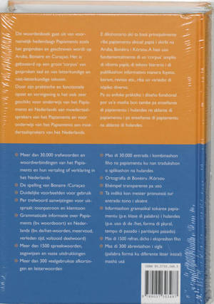 In dit woordenboek vindt u: - meer dan 30.000 trefwoorden en woordverbindingen van het Papiaments en hun vertaling of verklaring in het Nederlands - de spelling van Bonaire /Curaçao - duidelijke voorbeelden voor gebruik - per trefwoord aanwijzingen voor uitspraak: toonpatroon en klemtoon - grammaticale informatie over Papiaments (bv. woordsoort) en Nederlands (bv. de /het-woorden, meervoud, verleden tijd, voltooid deelwoord) - meer dan 1500 spreekwoorden, zegswijzen en vaste uitdrukkingen - meer dan 300 veelgebruikte afkortingen en letterwoorden