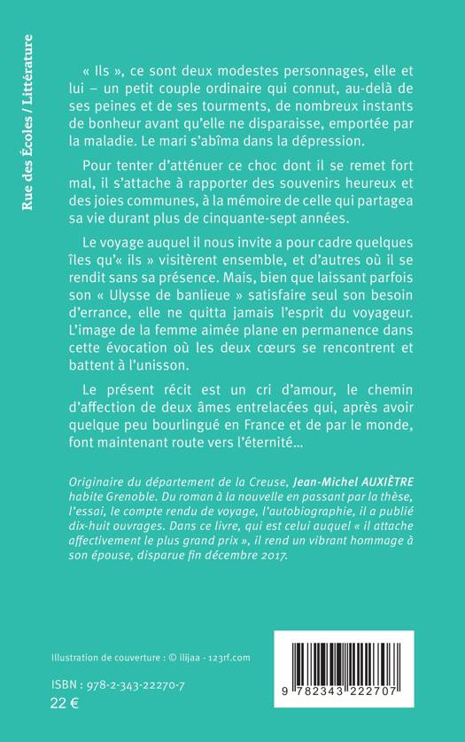 « Ils », ce sont deux modestes personnages, elle et lui un petit couple ordinaire qui connut, au-delà de ses peines et de ses tourments, de nombreux instants de bonheur avant qu’elle ne disparaisse, emportée par la maladie. Pour tenter d’atténuer ce choc dont il se remet fort mal, il s’attache à rapporter des souvenirs heureux et des joies communes, à la mémoire de celle qui partagea sa vie durant plus de cinquante-sept années. Le voyage auquel il nous invite a pour cadre quelques îles qu’« ils » visitèrent ensemble, et d’autres où il se rendit sans sa présence. Le présent récit est un cri d’amour, le chemin d’affection de deux âmes entrelacées qui, après avoir quelque peu bourlingué en France et de par le monde, font maintenant route vers l’éternité...
