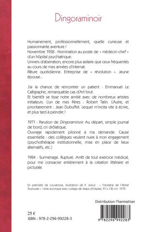 Humainement, professionnellement, quelle curieuse et passionnante aventure ! Novembre 1958 : Nomination au poste de "médecin-chef" d'un hôpital psychiatrique. Je rencontre un patient : Emmanuel Le Calligraphe, remarquable cas d'Art brut. Bientôt se tisse notre amitié avec de nombreux artistes initiateurs, prioritairement Dubuffet. 1971 : Parution de Dingoraminoir, ouvrage pilonné à ma demande... 1984 : Surmenage. Arrêt de la médecine pour me consacrer à la création littéraire et picturale.