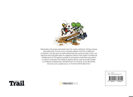 Dingues de Trail, c'est un album de 93 dessins de Wingz, illustrant avec humour le monde du trail : le matériel, les blessures, l'entraînement, la nutrition, la vie de famille, les pros, tout y passe !