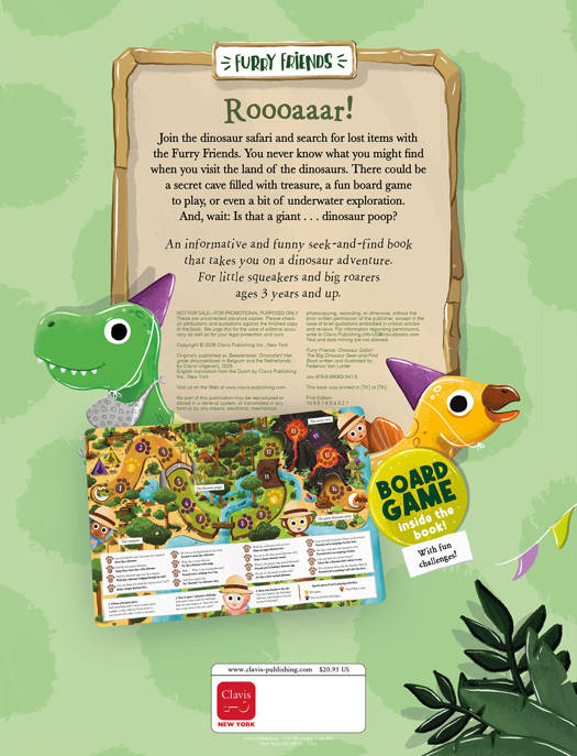 An educational and funny search book that takes you on an adventurous journey through the dinosaur kingdom. For little creatures and big roarers ages 3 years and up. Roooaaar! Join the dinosaur safari and search for lost items together with the Furry Friends. Traverse the dense dinosaur forest, wade through the giant dinosaur dung, and search for the sunken treasure chest in the dinosaur lake.