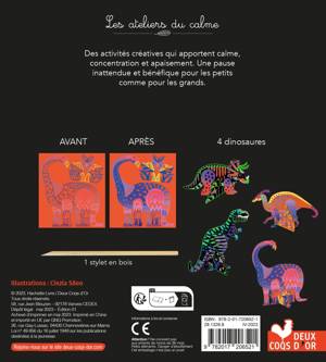 Découvre dans cette boite 4 modèles de dinosaures à gratter et à monter. Avec des encres de couleur et des effets fluo, et des socles pour faire tenir tes dinosaures debout et jouer ou décorer ta chambre.