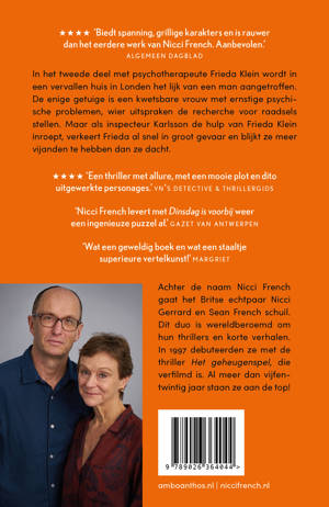 • Blauwe maandag • Dinsdag is voorbij • Wachten op woensdag • Donderdagskinderen • Denken aan vrijdag • Als het zaterdag wordt • Zondagochtend breekt aan • De dag van de doden 'Wat een geweldig boek en wat een staaltje superieure vertelkunst.' - Margriet 'Het schrijversduo Nicci French heeft met psychoanalytica Frieda Klein een goudmijntje aangeboord. In de tweede thriller betoont ze zich bij een complexe moordzaak wederom doortastend.' - Nu.nl 'Dinsdag is voorbij is zeker een plekje in de vakantiekoffer waard. […] Dinsdag is voorbij biedt spanning, grillige karakters en is rauwer dan het eerdere werk van Nicci French. Aanbevolen.' - Algemeen Dagblad 'Nicci French heeft in een fraaie, strakke compositie een eigentijdse heldin geschapen.' - de Volkskrant 'Dinsdag is voorbij is een thriller met allure, met een mooi plot en dito uitgewerkte personages.' - Vrij Nederland 'De term literaire thriller mag dan tegenwoordig werkelijk overal op worden geplakt, dit is er echt een. ' - Leeuwarder Courant