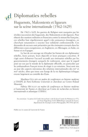 Le but de cet ouvrage est d'étudier les formes de ces diplomaties rebelles, leurs acteurs, leurs objectifs et leurs pratiques concrètes. Il s'agit aussi d'observer l'accueil accordé aux émissaires rebelles par les gouvernements étrangers auxquels ils s'adressent, ainsi que le regard posé sur eux par le monde de la diplomatie officielle, en particulier par les ambassadeurs français tenus de réagir à ces missions. Ainsi sont mis au jour des aspects méconnus des relations internationales des XVIe et XVIIe siècles, alors que toute une frange de la vie diplomatique échappe encore largement au contrôle des États.