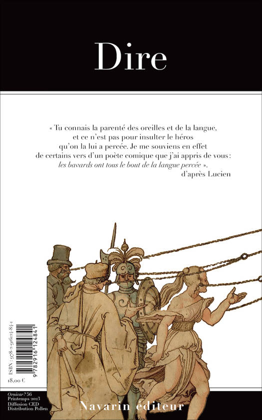 Ornicar ? 56 – Dire<br /><br /><br /><br /> s./dir. Jacques-Alain Miller et Deborah Gutermann-Jacquet<br /><br /><br /><br /> Suffit-il de dire « Je suis » pour être ? Qu’est-ce qu’un dire qui fait acte ? Ce numéro d’« Ornicar ? » explore la pluralité des manières de dire, à travers les époques et les discours : de l’Antiquité romaine, où « n’agit que le dire », à l’idéal d’« autodétermination » de certains contemporains rêvant de se signifier sans médiation de l’Autre.<br /><br /><br /><br /> Telle parole de l’Autre (père, mère, etc.) peut prendre une valeur déterminante pour le sujet, parfois à son insu. Si la parole a un pouvoir, comment accède-t-elle au statut d’un dire qui compte ? Lacan distingue ce qui « se dit » et le « dire ». <br /><br /><br /><br /> Le pari de la psychanalyse est de faire fond sur la puissance de la parole pour interpréter : produire un « dire », porté par une énonciation, apte à dépétrifier, à faire chuter les identifications mortifiantes avec lesquelles le sujet se défend de la vie.<br /><br /><br /><br /> Découvrons les richesses du dire dans les facéties de la Renaissance, la « disputatio » médiévale, le « flow » des rappeurs et son usage dans la psychanalyse.<br /><br /><br /><br />