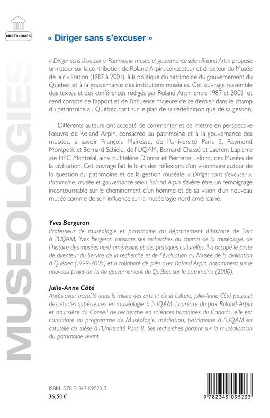 Cet ouvrage propose un retour sur la contribution de Roland Arpin, concepteur et directeur du Musée de la civilisation (1987 à 2001) à la politique du patrimoine du gouvernement du Québec et à la gouvernance des institutions muséales. Il rassemble des textes et des conférences rédigés par Roland Arpin entre 1987 et 2003 et rend compte de l'apport et de l'influence majeure de ce dernier dans le champ du patrimoine au Québec.