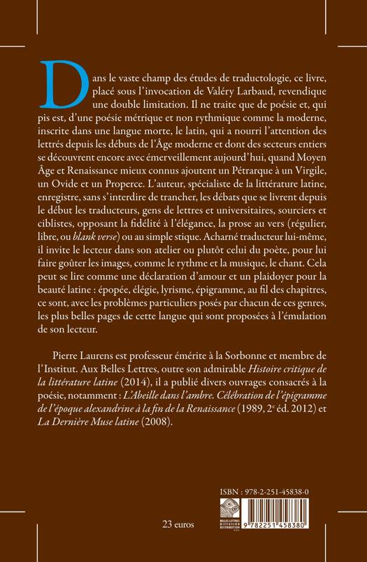 Dans le vaste champ des études de traductologie, ce livre, placé sous l’invocation de Valery Larbaud, revendique une double limitation. Il ne traite que de poésie et, qui pis est, d’une poésie métrique et non rythmique comme la moderne, inscrite dans une langue morte, le latin, qui a nourri l’attention des lettrés depuis les débuts de l’Âge moderne et dont des secteurs entiers se découvrent encore avec émerveillement aujourd’hui, quand Moyen Âge et Renaissance mieux connus ajoutent un Pétrarque à un Virgile, un Ovide et un Properce. L’auteur, spécialiste de la littérature latine, enregistre, sans s’interdire de trancher, les débats que se livrent depuis le début les traducteurs, gens de lettres et universitaires, sourciers et ciblistes, opposant la fidélité à l’élégance, la prose au vers (régulier, libre, ou blank verse) ou au simple stique. Acharné traducteur lui-même, il invite le lecteur dans son atelier ou plutôt celui du poète, pour lui faire goûter les images, comme le rythme et la musique, le chant. Cela peut se lire comme une déclaration d’amour et un plaidoyer pour la beauté latine : épopée, élégie, lyrisme, épigramme, au fil des chapitres, ce sont, avec les problèmes particuliers posés par chacun de ces genres, les plus belles pages de cette langue qui sont proposées à l’émulation de son lecteur.