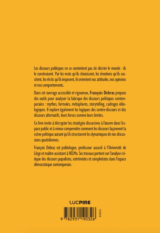 Des outils d'analyse des discours politiques contemporains, passant en revue les mythes, les formules, les métaphores, les cadrages idéologiques ou encore le storytelling. Politologue spécialisé dans l'analyse critique des discours populistes, extrémistes et complotistes, l'auteur examine les logiques des contre-discours et des discours alternatifs, ainsi que leurs forces et leurs limites.