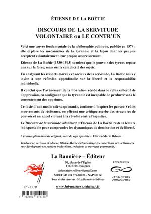 Voici une oeuvre fondamentale de la philosophie politique, publiée en 1574 ; elle explore les mécanismes de la tyrannie et la façon dont les peuples acceptent volontairement leur propre asservissement.