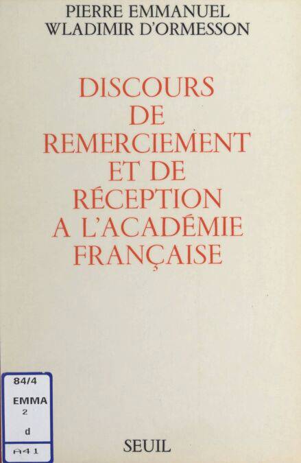 Deux discours à l'Académie française sont ici rassemblés : celui de Pierre Emmanuel qui, ayant été élu par l’Académie à la place rendue vacante par la mort du maréchal Juin, y est venu prendre séance le 5 juin 1969, remercie ses pairs. Et celui de Wladimir d'Ormesson qui, en réponse, et par son discours, accueille ce nouveau membre.