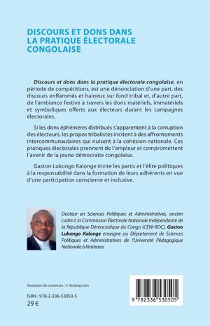 Discours et dons dans la pratique électorale congolaise, en période de compétitions, est une dénonciation d'une part, des discours enflammés et haineux sur fond tribal et, d'autre part, de l'ambiance festive à travers les dons matériels, immatériels et symboliques offerts aux électeurs durant les campagnes électorales. Si les dons éphémères distribués s'apparentent à la corruption des électeurs, les propos tribalistes incitent à des affrontements intercommunautaires qui nuisent à la cohésion nationale. Ces pratiques électorales prennent de l'ampleur et compromettent l'avenir de la jeune démocratie congolaise. Gaston Lukongo Kalonge invite les partis et l'élite politiques à la responsabilité dans la formation de leurs adhérents en vue d'une participation consciente et inclusive.