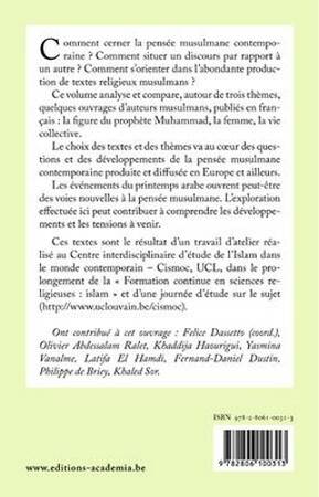 Cet ouvrage réunit des analyses relatives à la pensée d’une dizaine d’auteurs musulmans contemporains traitant de trois thématiques : le prophète, la femme, la vie collective. Le but est de mettre en évidence les différences des contenus de pensée et les différences de manière de construire l’argumentation et de se référer aux fondements de l’islam. La pensée musulmane est en bouillonnement. Le « printemps arabe » accélère ce processus. Cet ouvrage donne quelques balises pour cerner mieux les multiples tenants de ces courants de pensée.
