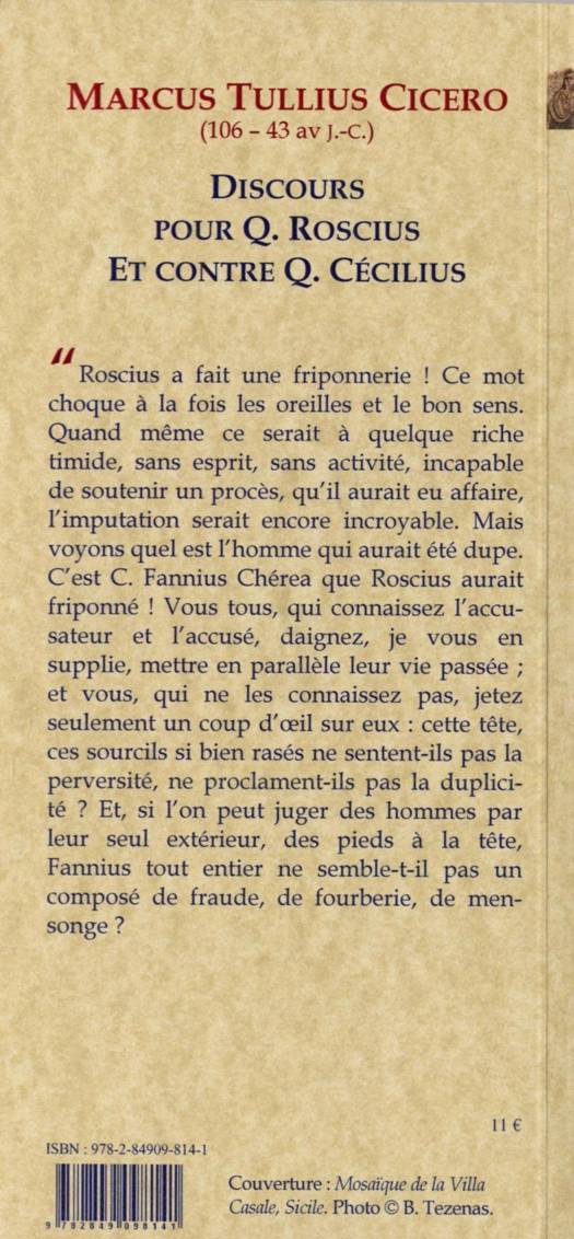 « Roscius a fait une friponnerie ! Ce mot choque à la fois les oreilles et le bon sens. Quand même ce serait à quelque riche timide, sans esprit, sans activité, incapable de soutenir un procès, qu'il aurait eu affaire, l'imputation serait encore incroyable. Mais voyons quel est l'homme qui aurait été dupe. C'est C. Fannius Chérea que Roscius aurait friponne ! Vous tous, qui connaissez l'accusateur et l'accusé, daignez, je vous en supplie, mettre en parallèle leur vie passée ; et vous, qui ne les connaissez pas, jetez seulement un coup d'oeil sur eux : cette tête, ces sourcils si bien rasés ne sentent-ils pas la perversité, ne proclament-ils pas la duplicité ? Et, si l'on peut juger des hommes par leur seul extérieur, des pieds à la tête, Fannius tout entier ne semble-t-il pas un composé de fraude, de fourberie, de mensonge ?