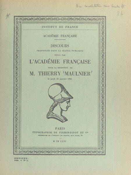 4. Discours prononcés dans la séance publique tenue par l'Académie française pour la réception de M. Thierry Maulnier, le jeudi 20 janvier 1966