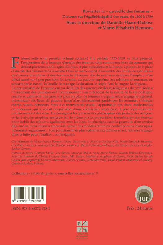La particularité de l'époque qui va de la fin des guerres civiles et religieuses du XVIe siècle à l'avènement des Lumières est l'accroissement sans précédent de la mixité de la vie politique, sociale et culturelle française : de plus en plus de femmes s'expriment, s'engagent, agissent, investissent des lieux de pouvoir jusqu'alors jalousement gardés par les hommes, s'attirant estime, succès, honneurs. Mais si ce mouvement suscite l'approbation des élites intellectuelles européennes, qui y voient l'expression d'une civilisation supérieure, il provoque aussi des raidissements et des refus. En témoignent les opinions des philosophes, des juristes, des religieux et des écrivains utopistes analysées ici, de même que les propositions formulées par des femmes pour établir des relations égalitaires entre les êtres. En témoigne aussi la poursuite d'un combat déjà ancien, mais toujours renouvelé, autour des modèles féminins (contemporains, historiques, fictionnels, légendaires...) qui paraissaient les plus opérants aux femmes et aux hommes engagés dans la lutte pour l'égalité... ou l'inégalité.