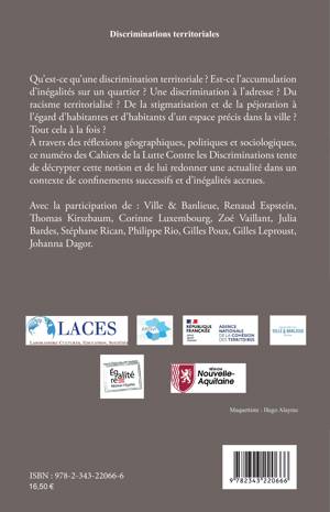 Qu'est-ce qu'une discrimination territoriale ? Est-ce l'accumulation d'inégalités sur un quartier ? Une discrimination à l'adresse ? Du racisme territorialisé ? De la stigmatisation et de la péjoration à l'égard d'habitantes et d'habitants d'un espace précis dans la ville ? Tout cela à la fois ? À travers des ré¬flexions géographiques, politiques et sociologiques, ce numéro des Cahiers de la Lutte Contre les Discriminations tente de décrypter cette notion et de lui redonner une actualité dans un contexte de confinements successifs et d'inégalités accrues.