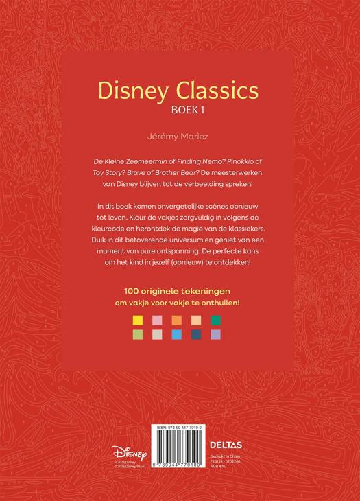 De meesterwerken van Disney blijven tot de verbeelding spreken! In dit boek komen onvergetelijke scènes opnieuw tot leven. Kleur de vakjes zorgvuldig in volgens de kleurcode en herontdek de magie van de klassiekers.
