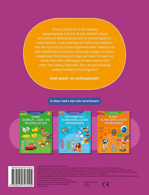 Hoera, je kind zit in het tweede leerjaar/groep 4 en kan al vlot rekenen, lezen en schrijven! Belangrijk dus om de leerstof goed te onderhouden. In dit boek kan je kind verder oefenen met wat hij of zij op school al geleerd heeft: rekenen tot 100, hoofdletters schrijven, vermenigvuldigen en delen, vraagzinnen formuleren en nog veel meer. En wat is er leuker dan deze oefeningen te doen samen met Peter Pan, Dusty, Rapunzel, Dory en een heleboel andere favoriete Disneyfiguren? Veel speel- en oefenplezier!