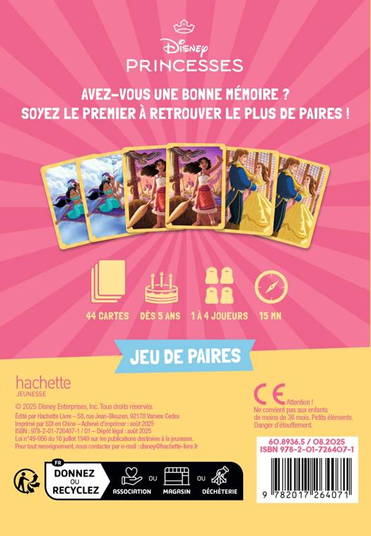 Le jeu des paires des Princesses Disney ! Un jeu et des personnages appréciés par les enfants dès 5 ans. Un packaging très pratique pour ranger les cartes à la fin de la partie. Une identité visuelle qui donne envie de collectionner les boîtes.