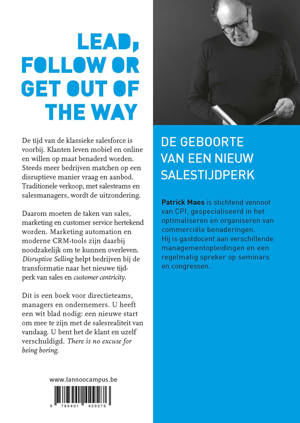 Slimme verkopers gaan voor een aanpak op maat De tijd van de klassieke salesforce is voorbij. Klanten leven mobiel en online en willen op maat benaderd worden. Steeds meer bedrijven matchen op een disruptieve manier vraag en aanbod. Traditionele verkoop, met salesteams en salesmanagers, wordt de uitzondering. Daarom moeten de taken van sales, marketing en customer service hertekend worden. Marketing automation en moderne CRM-tools zijn daarbij noodzakelijk om te kunnen overleven. Disruptive Selling helpt bedrijven bij de transformatie naar het nieuwe tijdperk van sales en customer centricity. Dit is een boek voor directieteams, managers en ondernemers. U heeft een wit blad nodig: een nieuwe start om mee te zijn met de salesrealiteit van vandaag. U bent het de klant en uzelf verschuldigd. There is no excuse for being boring.
