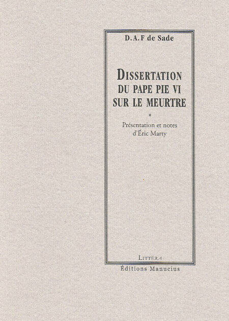 Des discours contenus dans les romans de Sade, le grand public ne connaît que le fameux « Français encore un effort si vous voulez être républicains » extrait de La Philosophie dans le boudoir. « La “dissertation” du pape Pie VI sur le meurtre » mérite la même attention. Elle se situe dans la quatrième partie d’Histoire de Juliette au moment où l’héroïne, arrivée à Rome et n’ayant de cesse de rencontrer le pape, obtient de lui, en échange d’une orgie, ce long discours. Le pape s’exécute d’une manière magistrale, et donne un véritable morceau d’anthologie de la philosophie sadienne. Pie VI ne se contente pas en effet de déconstruire les préjugés courants de l’opinion sur la question, il renverse toute notre conception du meurtre en réfutant sa nature criminelle et donc en niant son existence comme crime : c’est, selon lui, parce que l’homme se croit centre du monde qu’il accorde au meurtre un tel statut. Et c’est jusqu’à la mort elle-même qui, avec Pie VI, perd toute signification. Mais Sade, dans cette double négation, va plus loin qu’une simple remise en cause du sens commun, il propose une véritable métaphysique du néant où apparaît de manière limpide l’horizon même du désir sadien. C’est là sans aucun doute que se tient toute la singularité de l’écriture de Sade ».