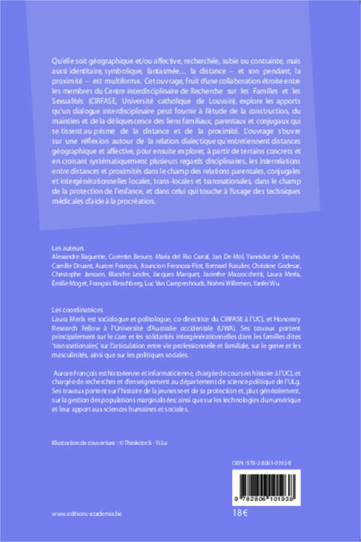 Qu'elle soit géographique et/ou affective, recherchée, subie ou contrainte, etc., la distance et son pendant, la proximité est multiforme. Cet ouvrage, fruit d'une collaboration interdisciplinaire étroite, explore les apports qu'un dialogue entre sciences sociales, histoire et psychologie peut fournir à l'étude de la construction, du maintien et de la déliquescence des liens familiaux, parentaux et conjugaux, saisis au prisme de la dialectique distance/proximité.