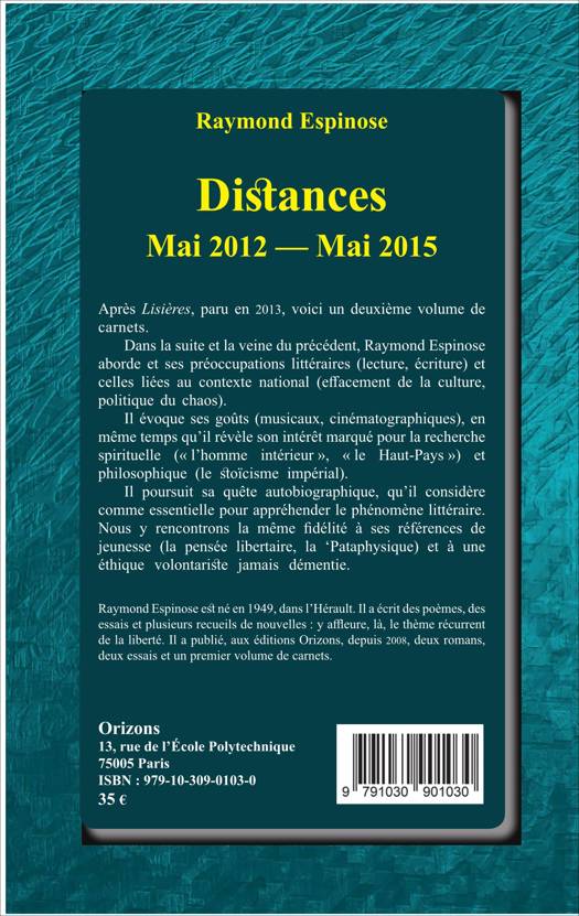 Après Lisières, paru en 2013, voici un deuxième volume de carnets. Raymond Espinose aborde et ses préoccupations littéraires (lecture, écriture) et celles liées au contexte national (effacement de la culture, politique du chaos). Il poursuit sa quête autobiographique, qu'il considère comme essentielle pour appréhender le phénomène littéraire. Nous y rencontrons la même fidélité à ses références de jeunesse (la pensée libertaire, la Pataphysique) et à une éthique volontariste jamais démentie.