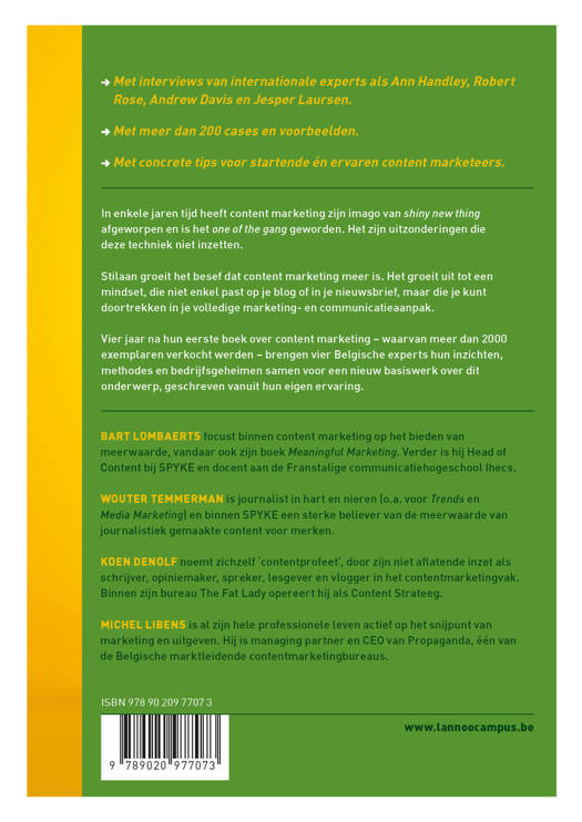 Vier jaar na hun eerste boek over content marketing - waarvan meer dan 2000 exemplaren verkocht werden - brengen vier Belgische experts hun inzichten, methodes en bedrijfsgeheimen samen voor een nieuw basiswerk over dit onderwerp, geschreven vanuit hun eigen ervaring.