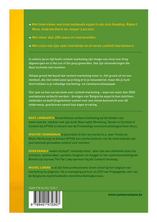 Met interviews van internationale experts als Ann Handley, Robert Rose, Andrew Davis en Jesper Laursen. Met meer dan 200 cases en voorbeelden. Met concrete tips voor startende én ervaren content marketeers. In enkele jaren tijd heeft content marketing zijn imago van shiny new thing afgeworpen en is het one of the gang geworden. Het zijn uitzonderingen die deze techniek niet inzetten. Stilaan groeit het besef dat content marketing meer is. Het groeit uit tot een mindset, die niet enkel past op je blog of in je nieuwsbrief, maar die je kunt doortrekken in je volledige marketing- en communicatieaanpak. Vier jaar na hun eerste boek over content marketing - waarvan meer dan 2000 exemplaren verkocht werden - brengen vier Belgische experts hun inzichten, methodes en bedrijfsgeheimen samen voor een nieuw basiswerk over dit onderwerp, geschreven vanuit hun eigen ervaring.