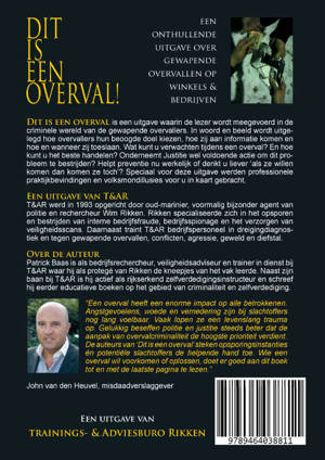 Dit is een overval is een uitgave waarin de lezer wordt meegevoerd in de criminele wereld van de gewapende overvallers. In woord en beeld wordt uitgelegd hoe overvallers hun beoogde doel kiezen, hoe zij aan informatie komen en hoe en wanneer zij toeslaan. Wat kunt u verwachten tijdens een overval? En hoe kunt u het beste handelen? Onderneemt Justitie wel voldoende actie om dit probleem te bestrijden? Helpt preventie nu werkelijk of denkt u liever ‘als ze willen komen dan komen ze toch’? Speciaal voor deze uitgave werden professionele praktijkbevindingen en volksmondillusies voor u in kaart gebracht. Een uitgave van T&AR T&AR werd in 1993 opgericht door oud-marinier, voormalig bijzonder agent van politie en rechercheur Wim Rikken. Rikken specialiseerde zich in het opsporen en bestrijden van interne bedrijfsfraude, bedrijfsspionage en het verzorgen van veiligheidsscans. Daarnaast traint T&AR bedrijfspersoneel in dreigingdiagnostiek en tegen gewapende overvallen, confl icten, agressie, geweld en diefstal.“Een overval heeft een enorme impact op alle betrokkenen. Angstgevoelens, woede en vernedering zijn bij slachtoffers nog lang voelbaar. Vaak lopen ze een levenslang trauma op. Gelukkig beseffen politie en justitie steeds beter dat de aanpak van overvalcriminaliteit de hoogste prioriteit verdient. De auteurs van ‘Dit is een overval’ steken opsporingsinstanties én potentiële slachtoffers de helpende hand toe. Wie een overval wil voorkomen of oplossen, doet er goed aan dit boek tot en met de laatste pagina te lezen.” John van den Heuvel, misdaadverslaggever