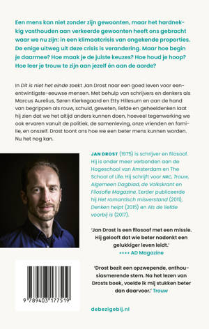 In Dit is niet het einde zoekt Jan Drost naar een goed leven voor eenentwintigste-eeuwse mensen. Met behulp van schrijvers en denkers als Marcus Aurelius, Søren Kierkegaard en Hannah Arendt en aan de hand van begrippen als rouw, schuld, geweten, liefde en geheeldenken laat hij zien dat we het altijd anders kunnen doen, hoeveel tegenwerking we ook ervaren vanuit de politiek, de samenleving, onze vrienden en familie en onszelf. Drost toont ons hoe we een beter mens kunnen worden. Nu het nog kan.
