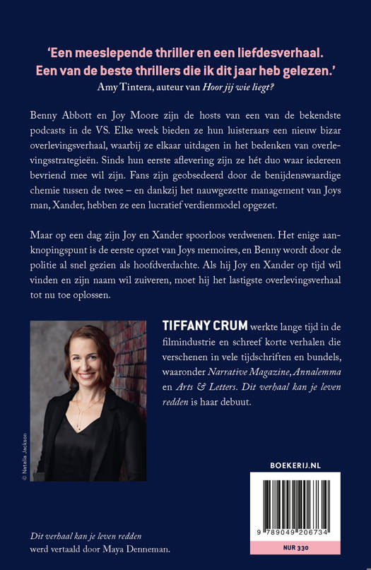 ‘Een razendsnel mysterie. Een liefdesverhaal dat blijft hangen. Dit verhaal kan je leven redden is even slim als hartverwarmend, met sprankelend proza, personages waar je wel van moet houden en een spannende puzzel als kern. Tiffany Crums debuut – en wat een debuut! – deed me koortsachtig de pagina’s omslaan, en toen het uit was, wenste ik dat ik nog even in haar wereld kon blijven.’ Kelsey Cox, auteur van Party of Liars