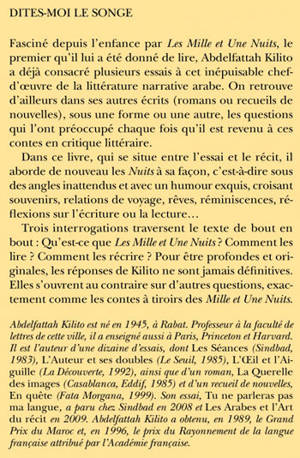 Fasciné depuis l'enfance par Les Mille et Une Nuits, le premier qu'il lui a été donné de lire, Abdelfattah Kilito a déjà consacré plusieurs essais à cet inépuisable chefd'oeuvre de la littérature narrative arabe. On retrouve d'ailleurs dans ses autres écrits (romans ou recueils de nouvelles), sous une forme ou une autre, les questions qui l'ont préoccupé chaque fois qu'il est revenu à ces contes en critique littéraire. Dans ce livre, qui se situe entre l'essai et le récit, il aborde de nouveau les Nuits à sa façon, c'est-à-dire sous des angles inattendus et avec un humour exquis, croisant souvenirs, relations de voyage, rêves, réminiscences, réfl exions sur l'écriture ou la lecture... Trois interrogations traversent le texte de bout en bout : Qu'est-ce que Les Mille et Une Nuits ? Comment les lire ? Comment les récrire ? Pour être profondes et originales, les réponses de Kilito ne sont jamais défi nitives. Elles s'ouvrent au contraire sur d'autres questions, exactement comme les contes à tiroirs des Mille et Une Nuits.