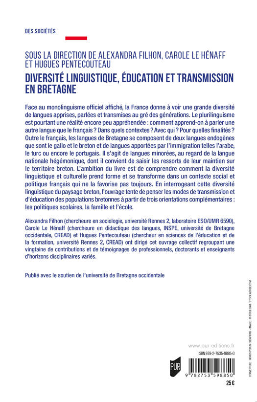 Face au monolinguisme officiel affiché, la France donne à voir une grande diversité de langues apprises, parlées et transmises au gré des générations. Le plurilinguisme est pourtant une réalité encore peu appréhendée : comment apprend-on à parler une autre langue que le français ? Dans quels contextes ? Avec qui ? Pour quelles finalités ? Outre le français, les langues de Bretagne se composent de deux langues endogènes que sont le gallo et le breton et de langues apportées par l’immigration telles l’arabe, le turc ou encore le portugais. Il s’agit de langues minorées, au regard de la langue nationale hégémonique, dont il convient de saisir les ressorts de leur maintien sur le territoire breton. L’ambition du livre est de comprendre comment la diversité linguistique et culturelle prend forme et se transforme dans un contexte social et politique français qui ne la favorise pas toujours. En interrogeant cette diversité linguistique du paysage breton, l’ouvrage tente de penser les modes de transmission et d’éducation des populations bretonnes à partir de trois orientations complémentaires : les politiques scolaires, la famille et l’école.